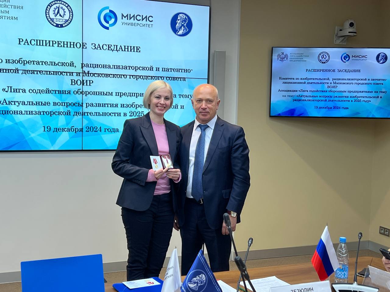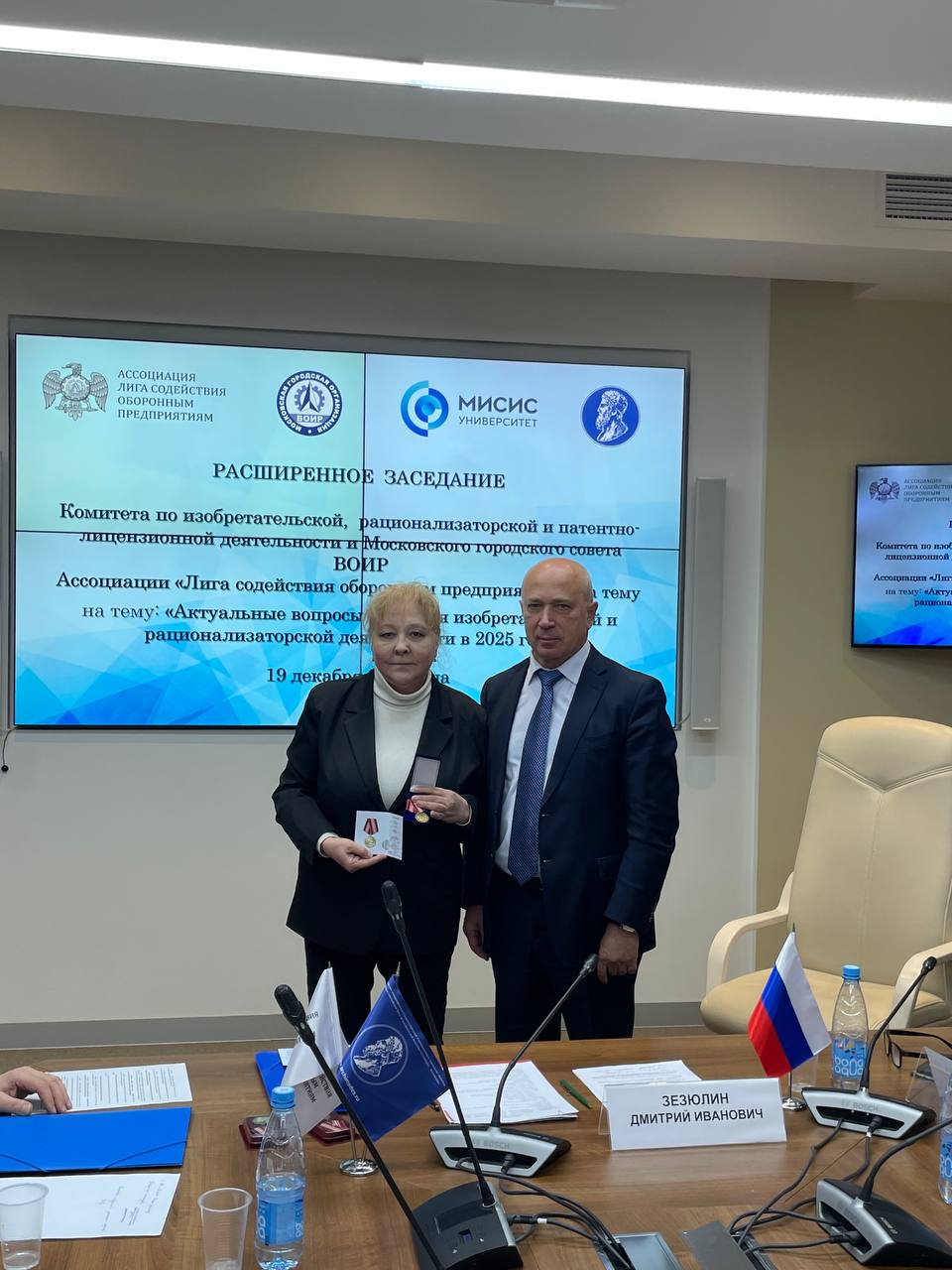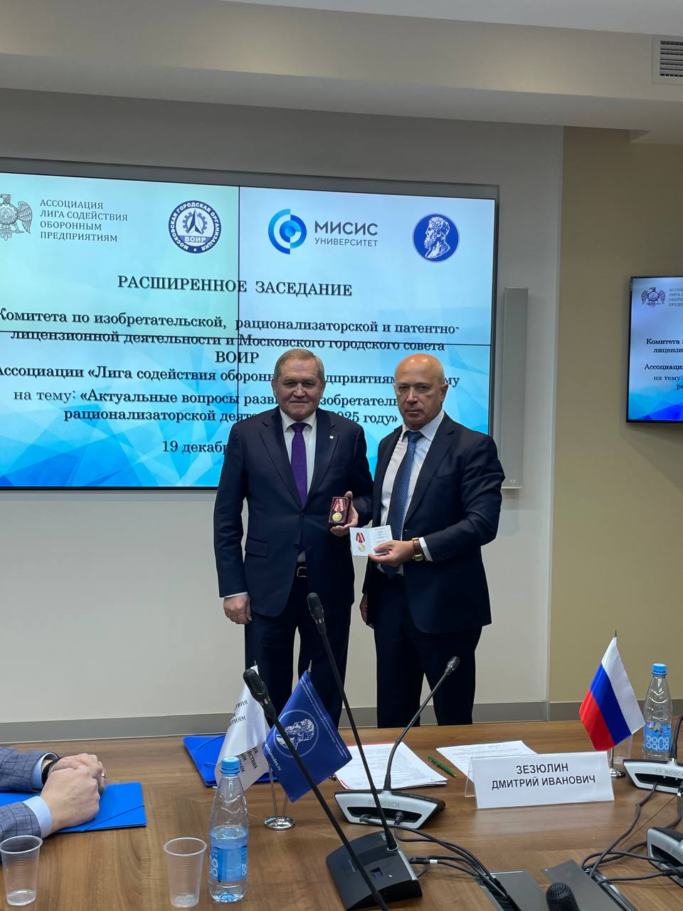 Председатель МГС ВОИР – Дмитрий Иванович Зезюлин – вручил медаль «За высокий вклад в развитие изобретательства» Саранцеву Василию Алексеевичу, Руководителю патентно-лицензионной службы АО «Российские космические системы», Гаврик Наталье Людвиговне, Начальнику отдела интеллектуальной собственности Управления науки НИТУ МИСИС, Афонин Игорь Сергеевич, Начальник Военной академии РВСН имени Петра Великого.