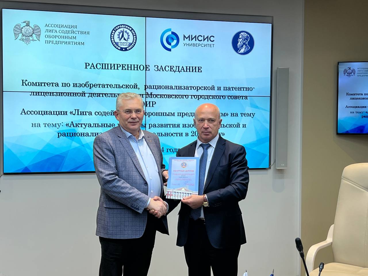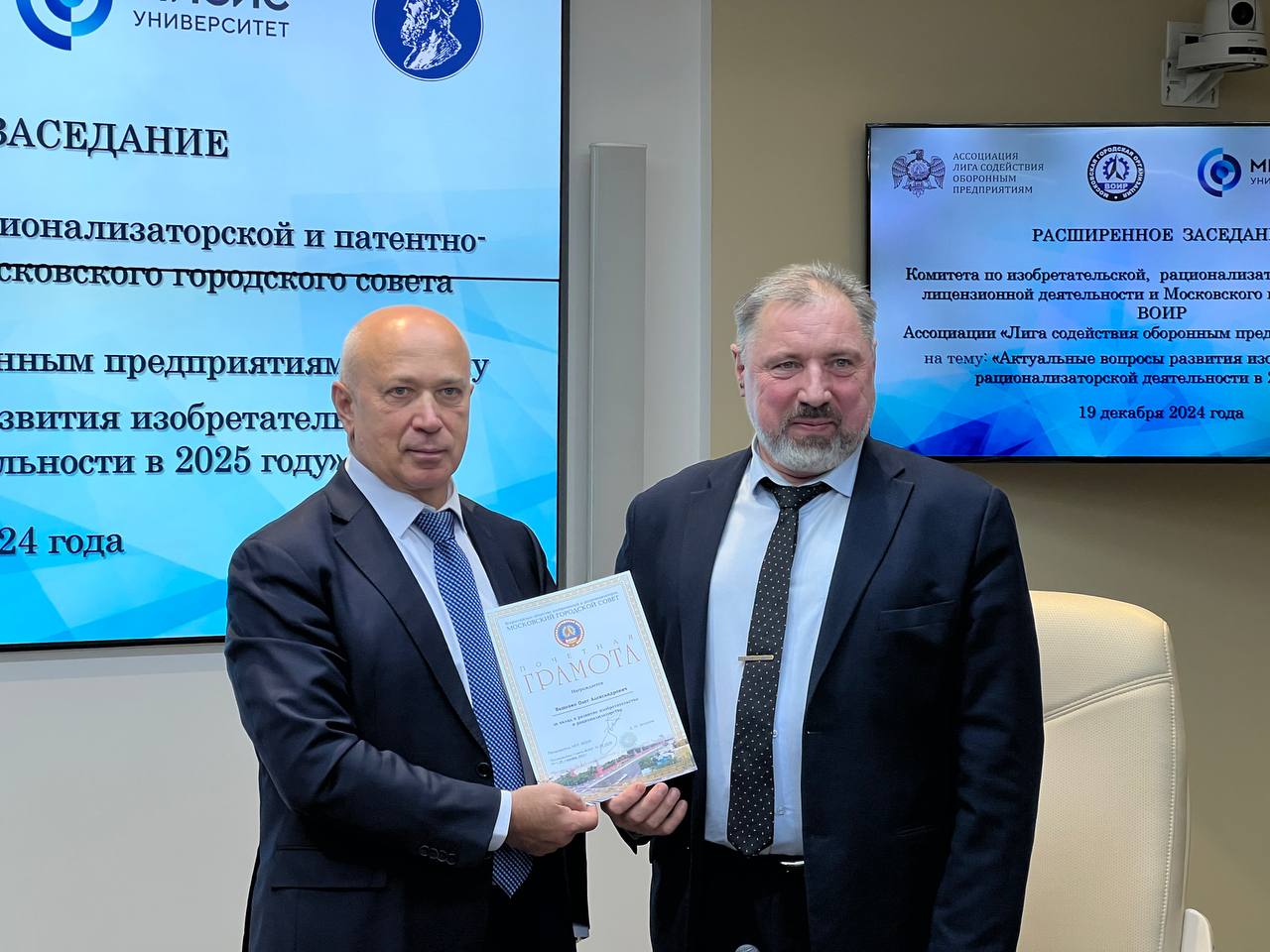19 декабря 2024 состоялось расширенное заседание Московского городского совета Всероссийского общества изобретателей и рационализаторов и Комитета по изобретательской, рационализаторской и патентно-лицензионной деятельности Ассоциации «Лига содействия оборонным предприятиям» на тему: «Актуальные вопросы развития изобретательской и рационализаторской деятельности в 2025 году».