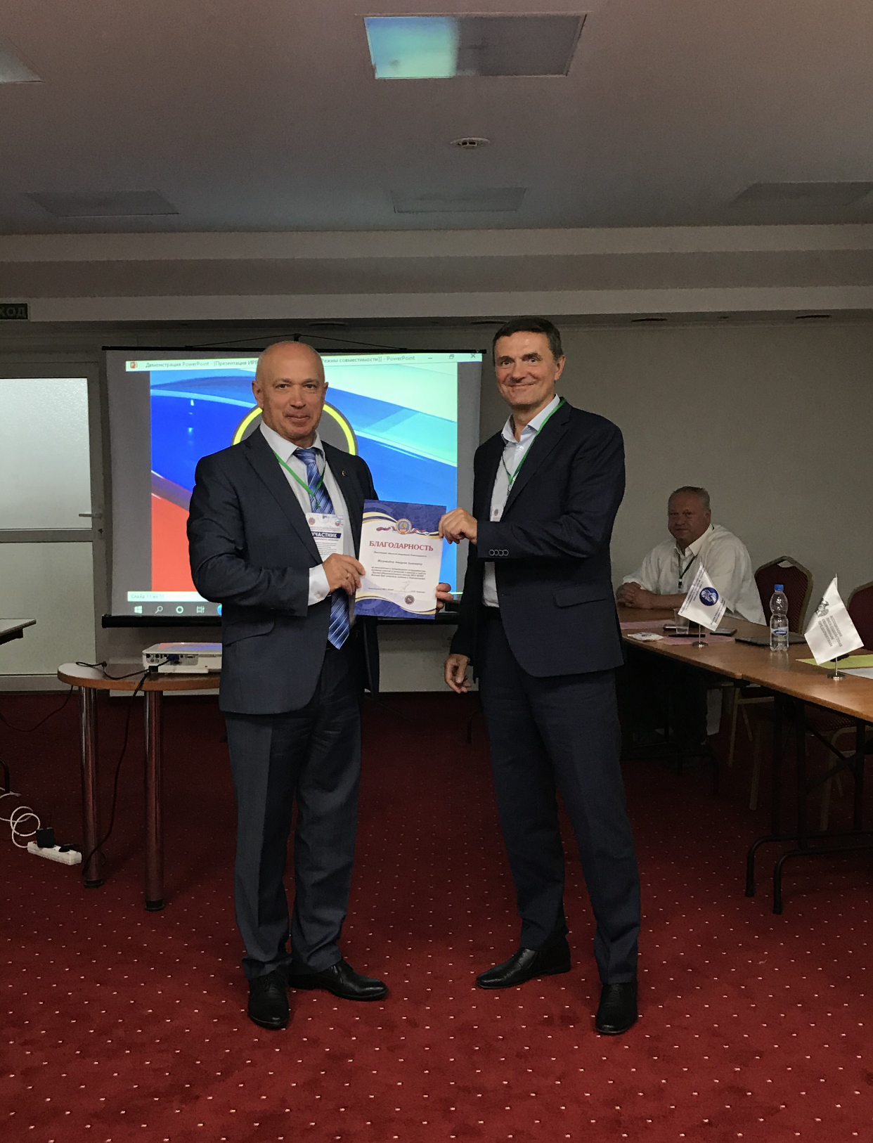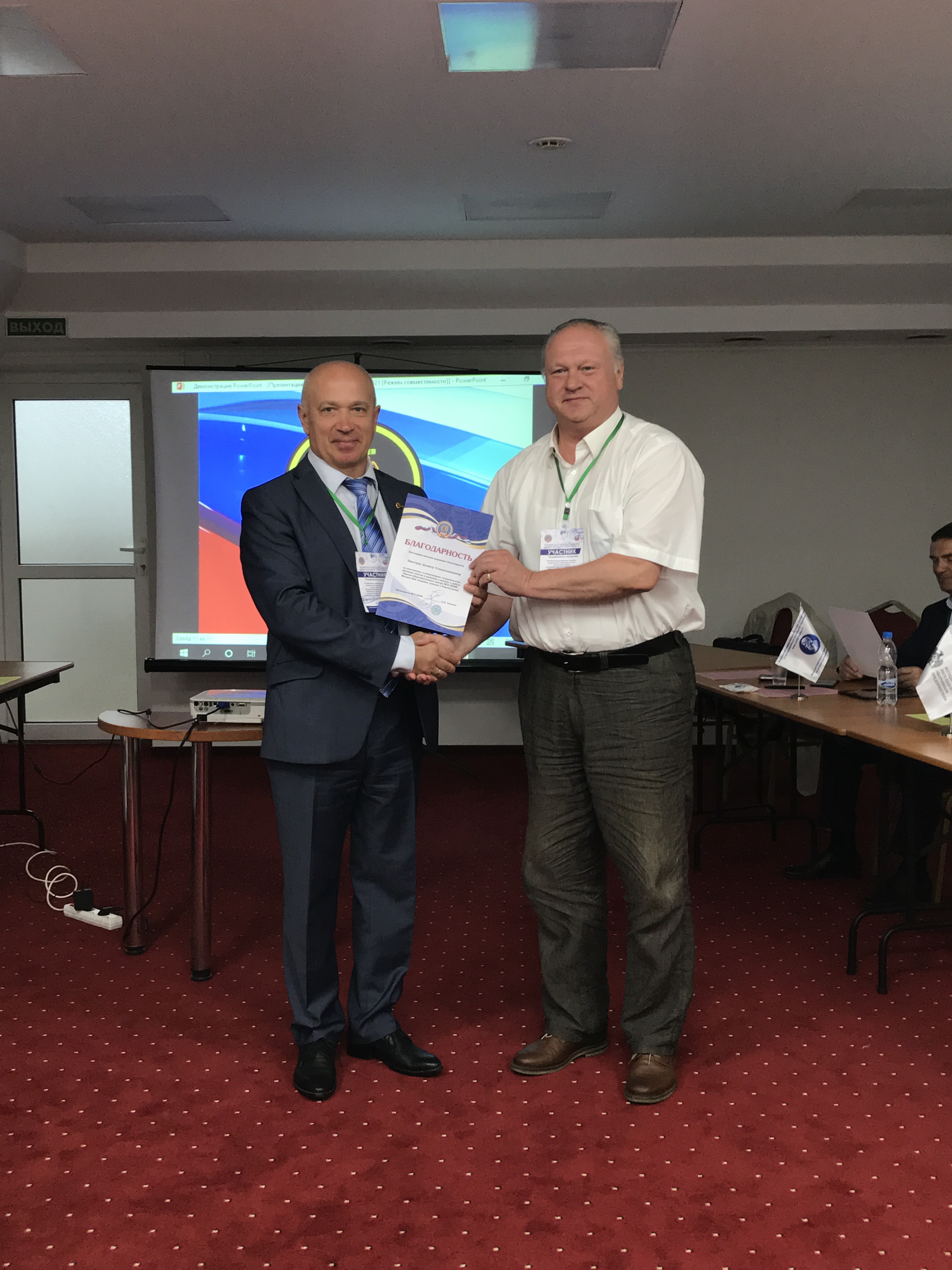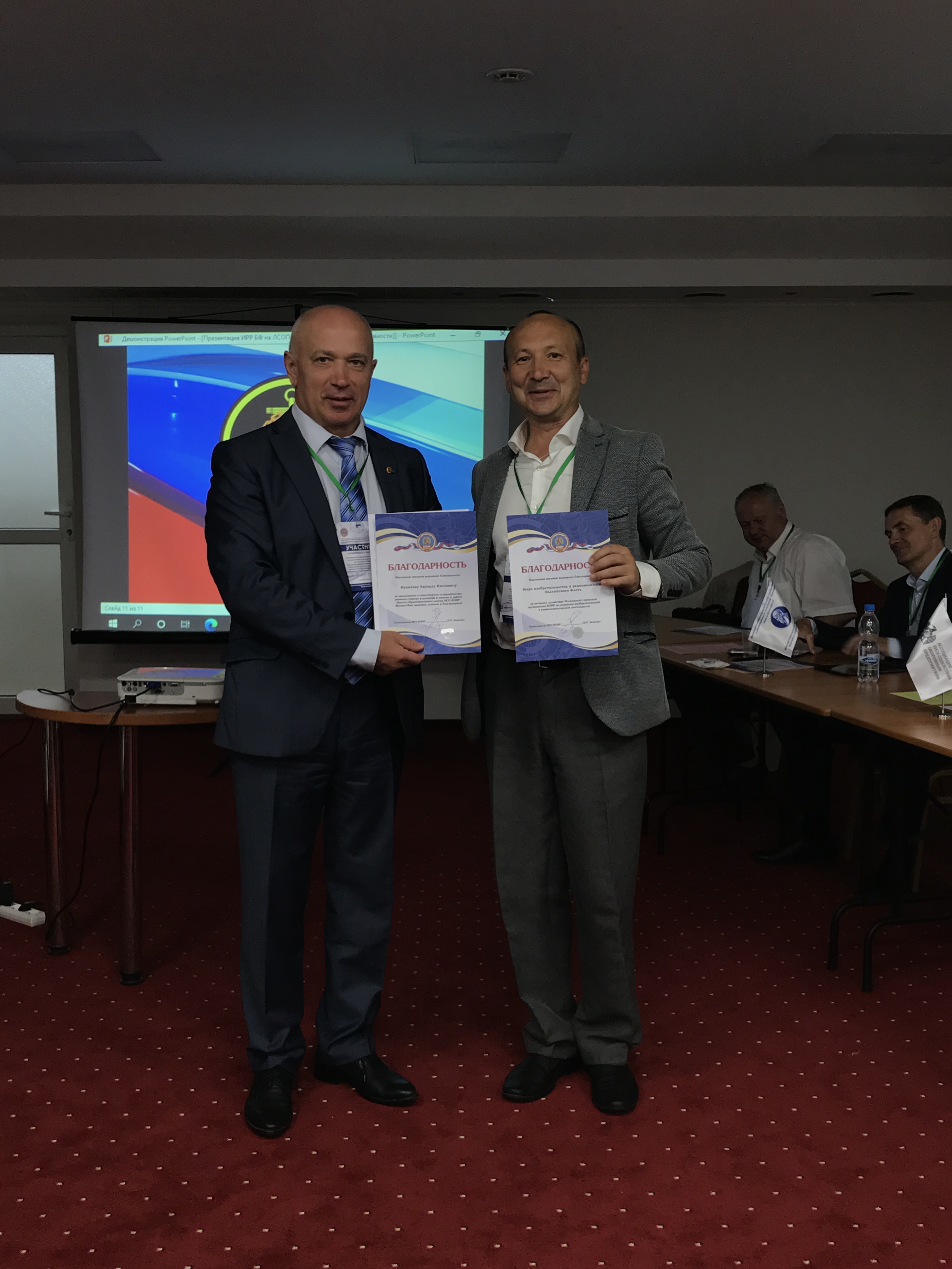 По окончании мероприятий в преддверии Дня изобретателя и рационализатора Председатель МГС ВОИР и Руководитель Комитета по изобретательской, рационализаторской и патентно-лицензионной деятельности Ассоциации «Лига содействия оборонным предприятиям» Дмитрий Иванович Зезюлин наградил благодарностями Московской городской организации ВОИР «За многолетнее и плодотворное сотрудничество, активное участие в развитии и помощь в работе Научно-образовательного центра МГО ВОИР» следующих участников мероприятия: Мельника Сергея Николаевича (ООО «РТ-Интеллектэкспорт»), Еремина Алексея Викторовича (ООО «РТ-Интеллектэкспорт»), Миневу Розу Анатольевну (ФГУП «ВНИИФТРИ»), Федосову Валентину Александровну (ФГУП «ВНИИФТРИ»), Журавлёва Андрея Львовича (Федеральный институт промышленной собственности), Мухитова Эдуарда Инесовича (Бюро изобретательства и рационализации Балтийского Флота), Пиотуха Дениса Станиславовича (ПАО «ОДК-Сатурн»), а так же благодарность «За активное содействие МГО ВОИР по развитию изобретательской и рационализаторской деятельности» получили ООО «РТ-Интеллектэкспорт» и Бюро изобретательства и рационализации Балтийского Флота. Отдельное спасибо организаторы выражают дирекции Отеля «Универсал», в котором прошли основные мероприятия Деловой программы.
